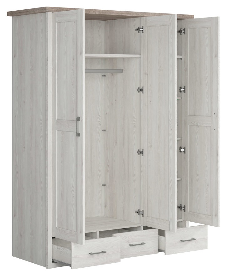 Kledingkast: De kledingkast heeft drie deuren, waarvan de middelste is voorzien van een spiegel. Achter de rechterdeur bevinden zich meerdere legplanken, terwijl de linker- en middelste deur een legplank en een roede bieden voor kleding.